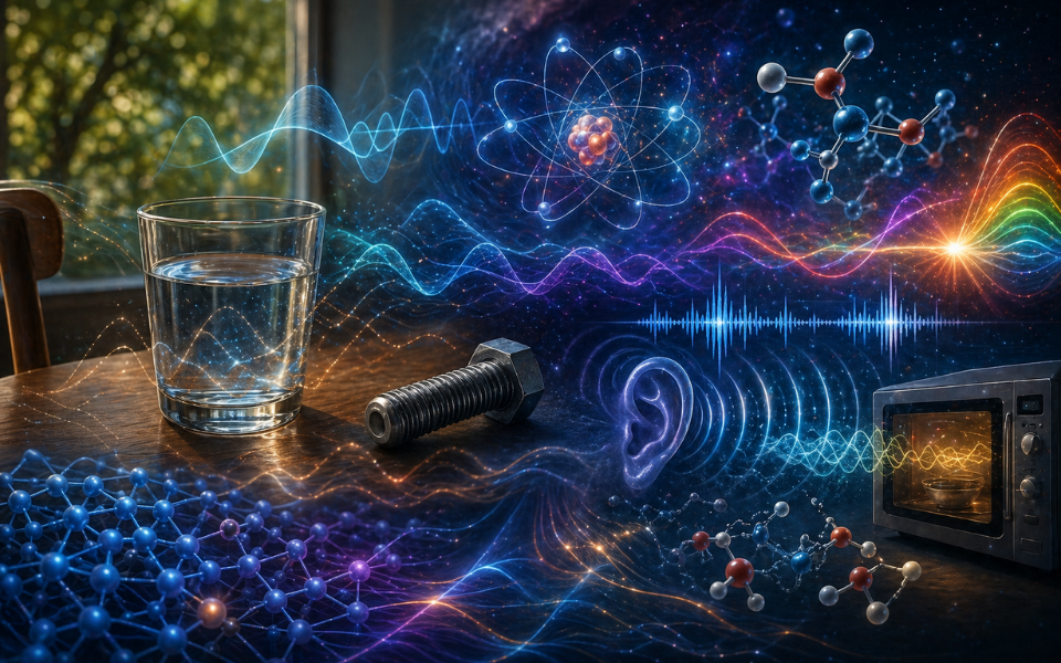 素粒子物理学の「場の量子論」という考え方では、電子や光子といった粒子は、空間に広がる「場」の振動として捉えられます。つまり、粒子そのものが振動の現れだという見方です。